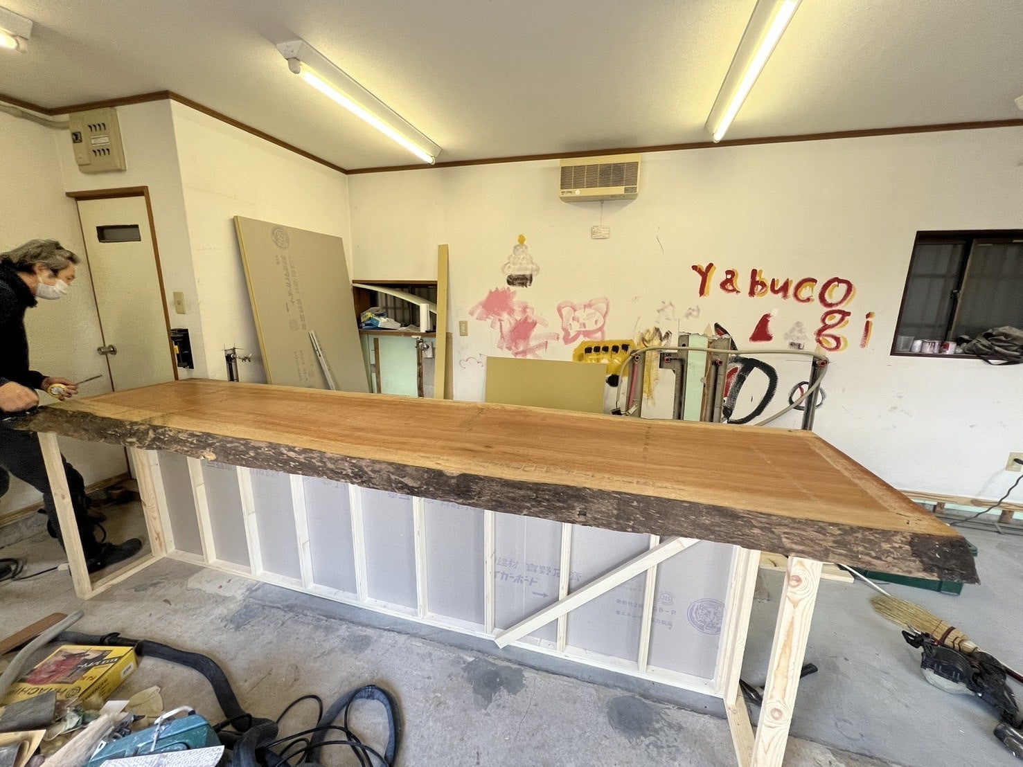 2024/03/13 16:23こんにちは!!yabucogiのおだしょーです。3月なのにまだまだ寒い日が続きますが、皆様如何お過ごしでしょうか。yabucogiは、3月は、週に2回をスクール、残りを4月の開校に向けて内装、カリキュラムの構築等、リターンの制作等、着々と準備を進めています。そしてなんと本日、地域の木材屋に発注していた天板が届きました!!この天板を購入できたのは、皆様のご支援のおかげです!!ちなみにこの天板はカウンターになります。とても立派な天板じゃないですか!?この木材屋の社長さんが、とても豪快な方で、おまけにyabucogiの看板用の木材もくれたので、yabucogiの看板を子どもたちと一緒に作っています笑こんな感じで、皆様のご支援と地域の力を使って着々と1階の改装を進めています!今後とも、yabucogiのことをよろしくお願いいたします!! もっと見るご支援、ご協力、ご拡散ありがとうございました!!