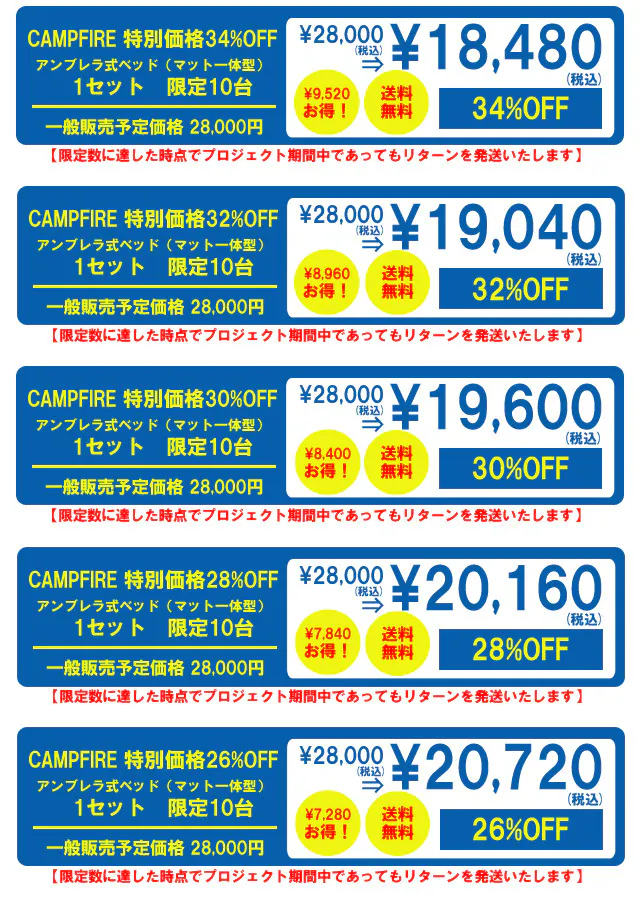 A:アンブレラ式ベッドマット一体型の一般販売につきましては、CAMPFIREからお申込み頂きました方へのリターン納品完了後に実施をする予定にしております。特別価格にてご入手いただけるこの機会に是非ご支援下さい。