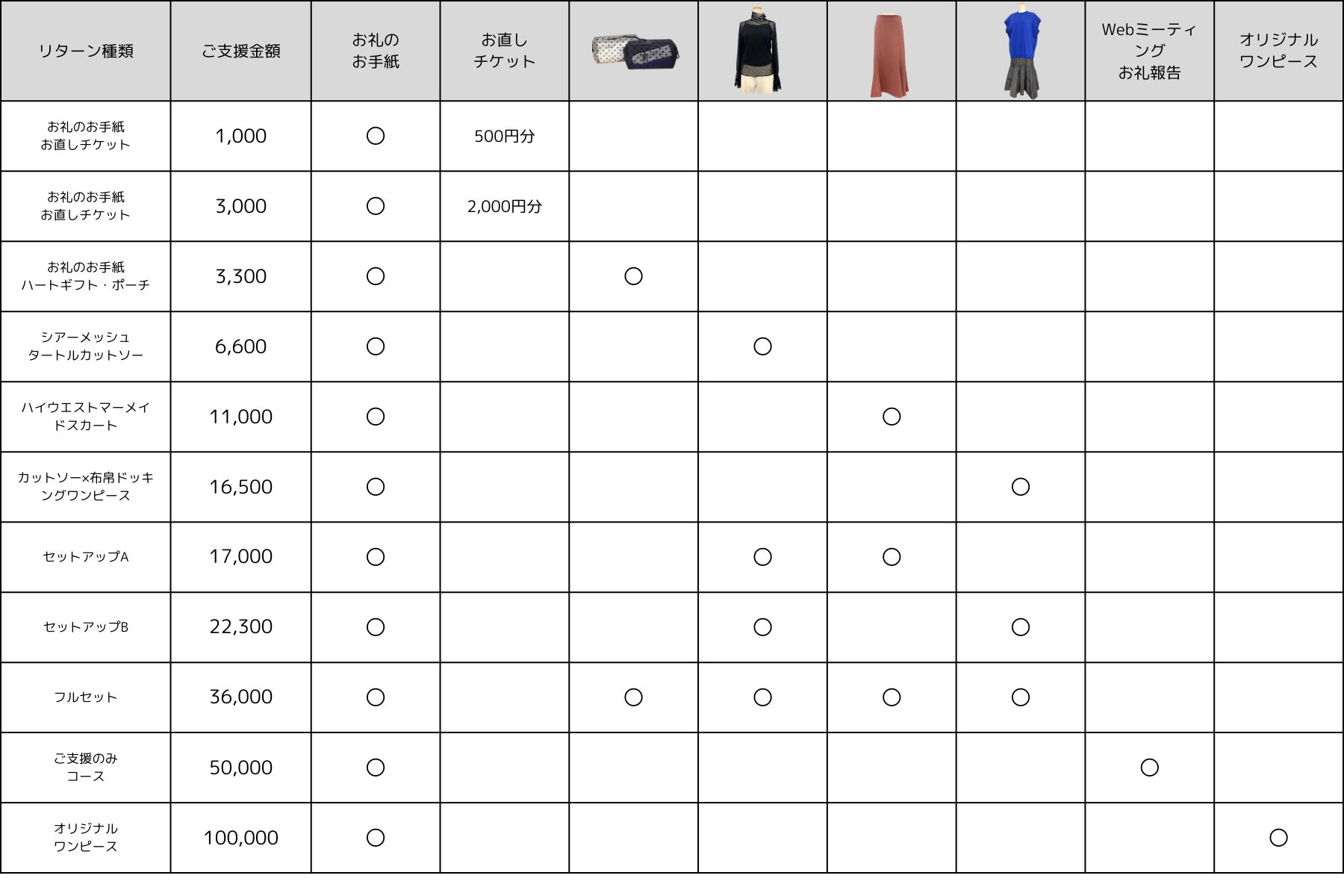 洋服のリターンに加えて、ポーチやお直しに使えるチケット、オリジナルワンピースの企画・制作など、さまざまなリターンを用意させていただいております。