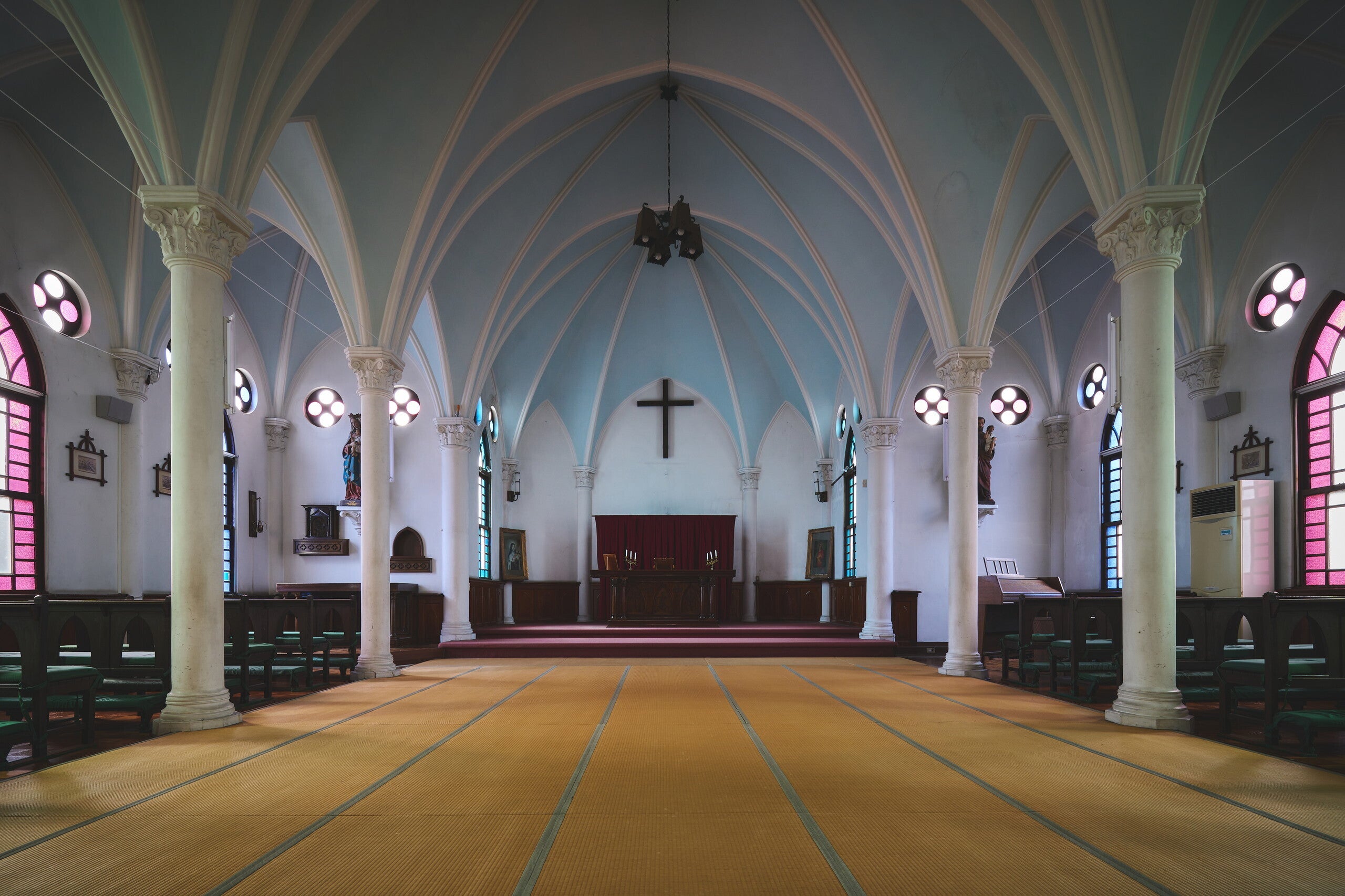 また、聖堂内の床には畳が敷かれていたり、ステンドグラスは障子を思わせるデザインであったりすることから、「日本人にとって親しみやすいカトリック教会」を意識して造られたこともうかがえます。