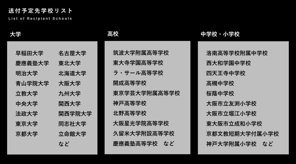下記は弊社が寄贈を予定している学校の一部抜粋です。イメージしやすいように全国的に知名度の高い学校を主に並べていますが、送付先は知名度に関係なく選定していきます。