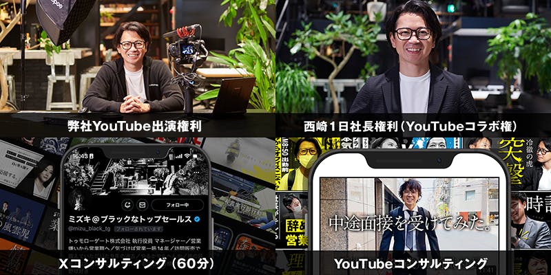弊社社員によるXコンサルティングやYouTubeコンサルティング、代表西崎へのアポイント権利、1日社長代行権利まで多様なリターンをご用意しています。詳しくはぜひリターン一覧よりご確認ください。