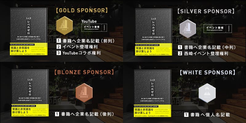 全国の学校に寄贈するにあたり、みなさんの名前をプロジェクトを支援いただいた方として書籍に掲載します。企業スポンサーにはゴールド、シルバー、ブロンズと3種類をご用意。イベント登壇権利やYouTubeコラボ権利などが付帯しているため、企業スポンサーとはさらにオモシロイ取り組みを行っていきたいと考えています。
