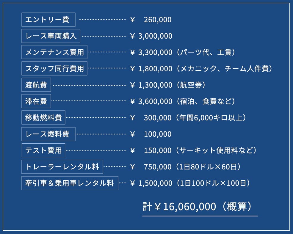 アメリカでは西海岸のLA近辺、ラスベガスあたりのレース場を転戦しますので、お越しいただければピットクルーとして2日間の大会に密着していただけます。空港からの送迎やレース場から滞在先までの送迎も私が責任を持ってやりますし、通訳もいますのでご安心くださいね。航空券や宿泊先の確保、滞在中の実費に関してはご負担をお願いいたします!
