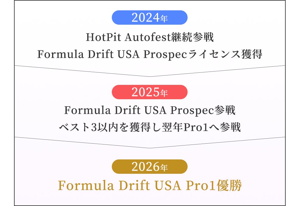アメリカで目指すドリフト世界一を現実のものとするために、NEXTゴールを設定し、