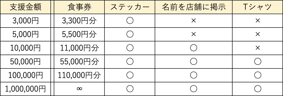 ご支援いただいた金額+10%のお食事券となっております。