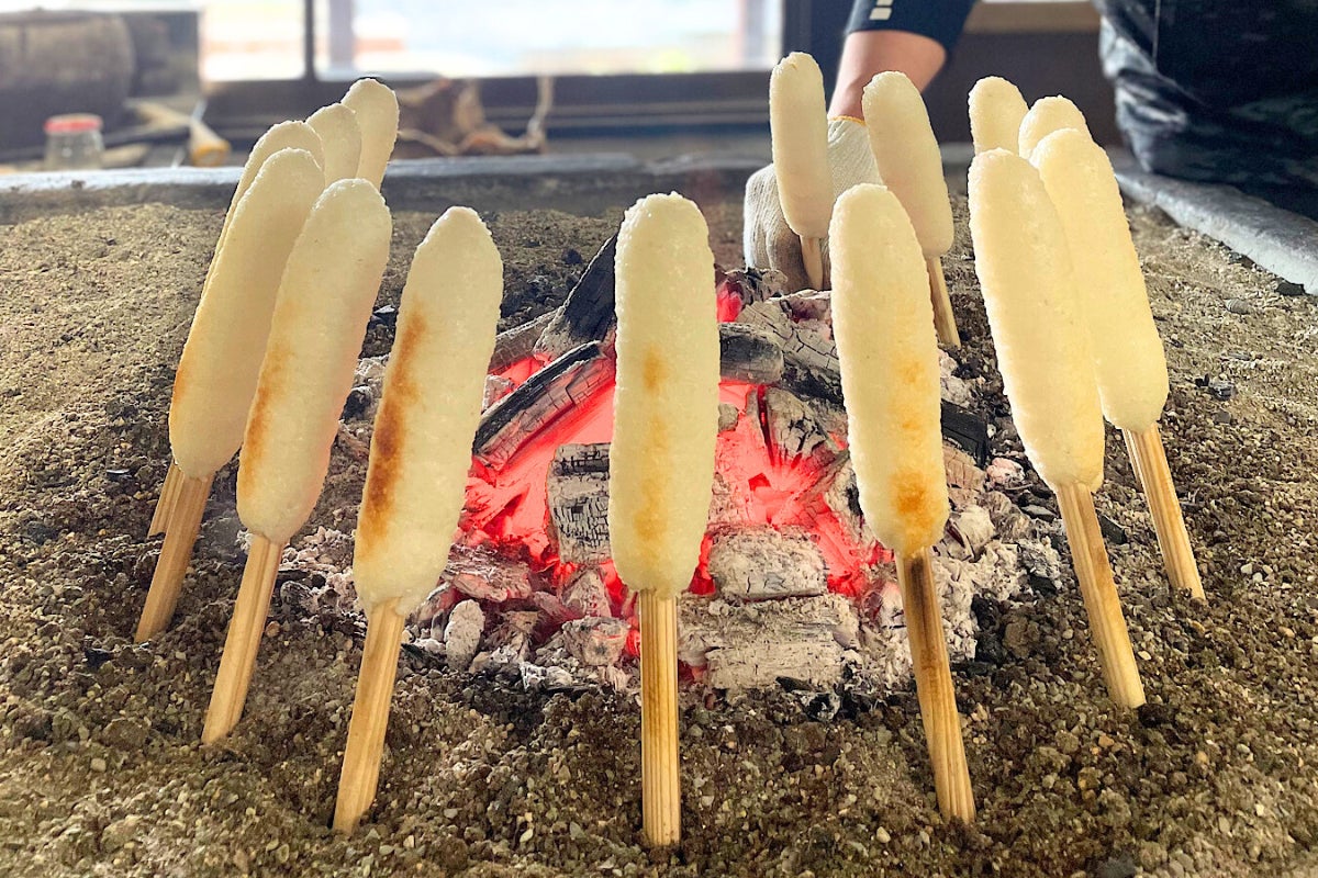 きりたんぽの仕上げの焼きは、鮎と同様炭火焼です。良い色合いまでじっくり、ふっくら香ばしく焼き上げます。囲炉裏には一度に20本も刺さらないので、この作業を何度か繰り返しても、きりたんぽを作るのは1日数十本を作るのが限界です。