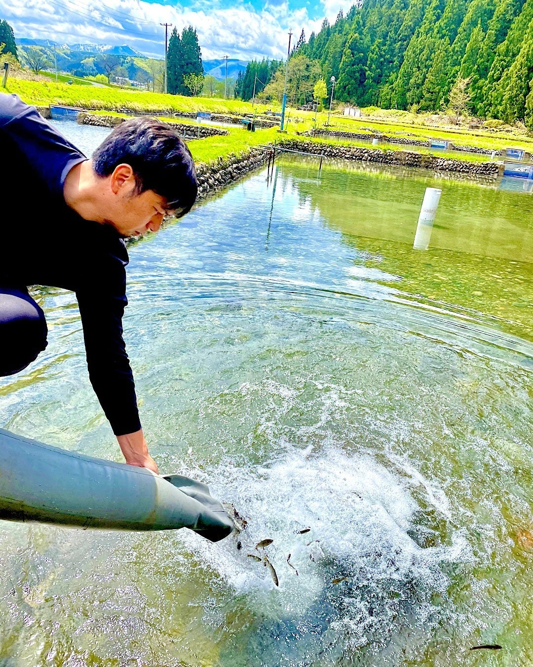 鮎の生産者としては生産量は多い方ではありませんが、鮎にストレスを与えない環境に気を配り、河川放流する鮎と店舗で提供する鮎をのびのびと育てています。