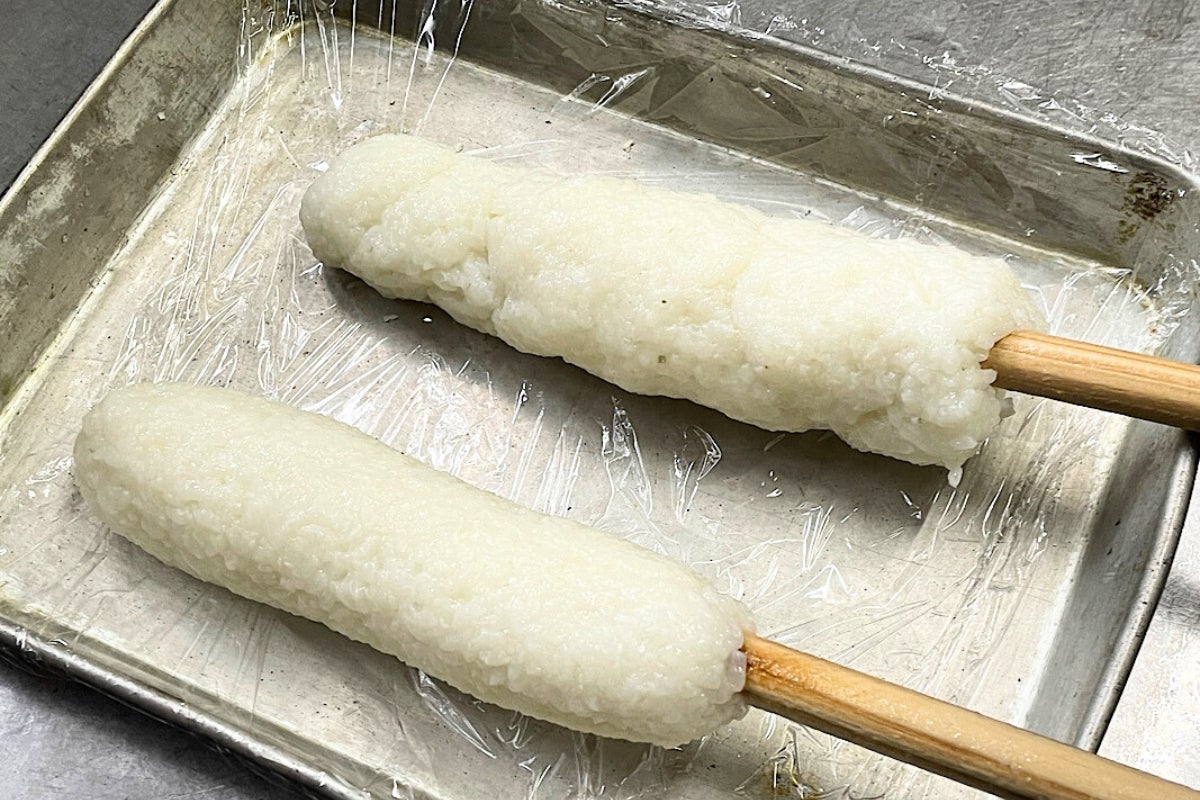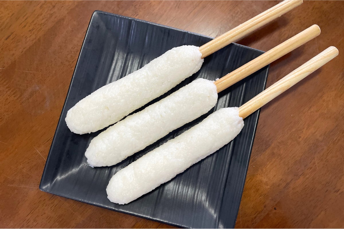 きりたんぽ作りに慣れていない方が作ると下の写真の奥のようなきりたんぽになってしまいます。