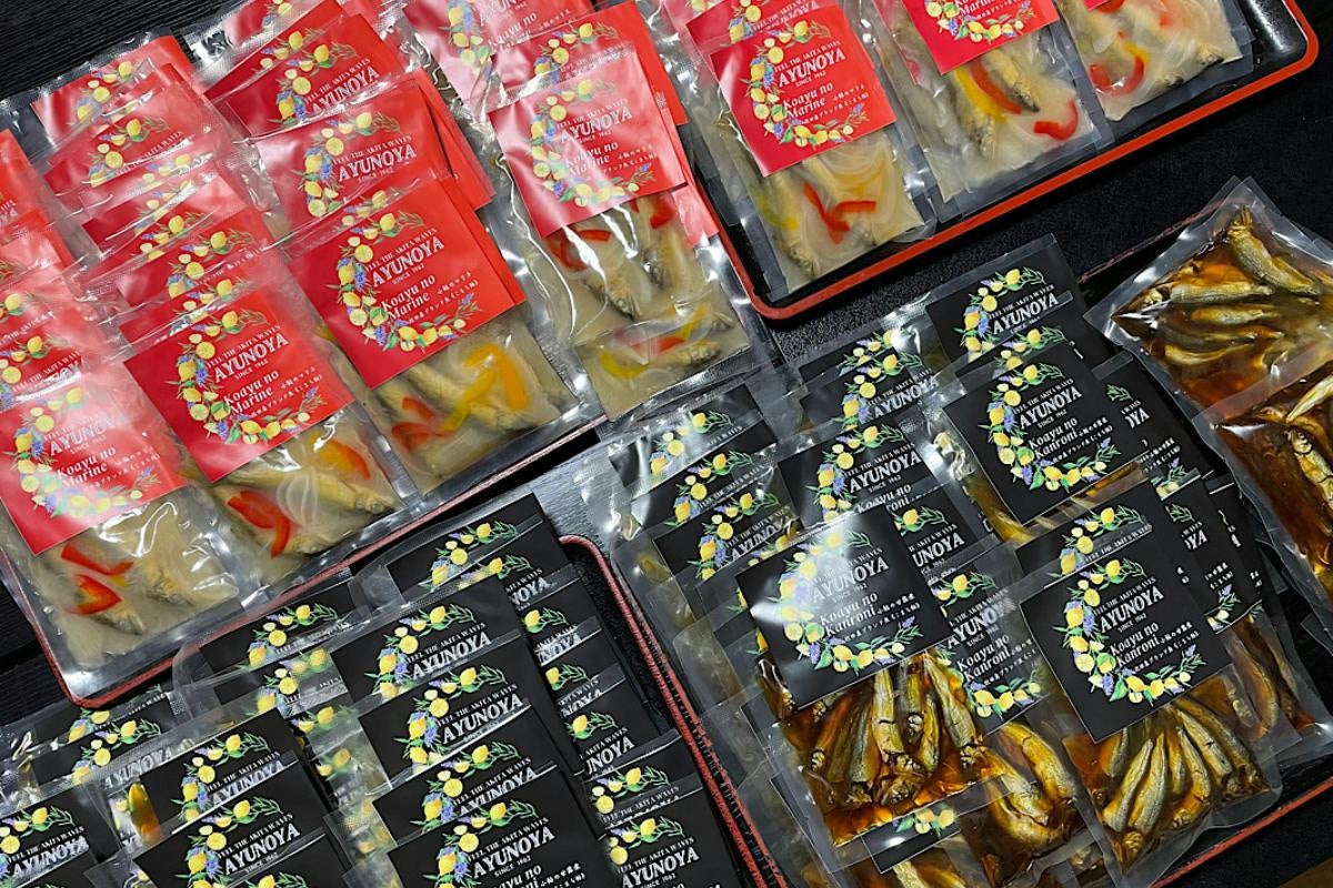 商品はどの大きさの袋に詰めたらいいか、数量をかえて試作をいくつも作りました。パッケージデザインは素人ながら家内が担当しました。鮎を育てるところから、商品をお客様のお手元に届けるまで自分たちで行うことで費用を抑え商品を完成させました。2022年2月ネット販売開始。初めてネットで売れた商品は「小鮎のマリネ」一つでした。