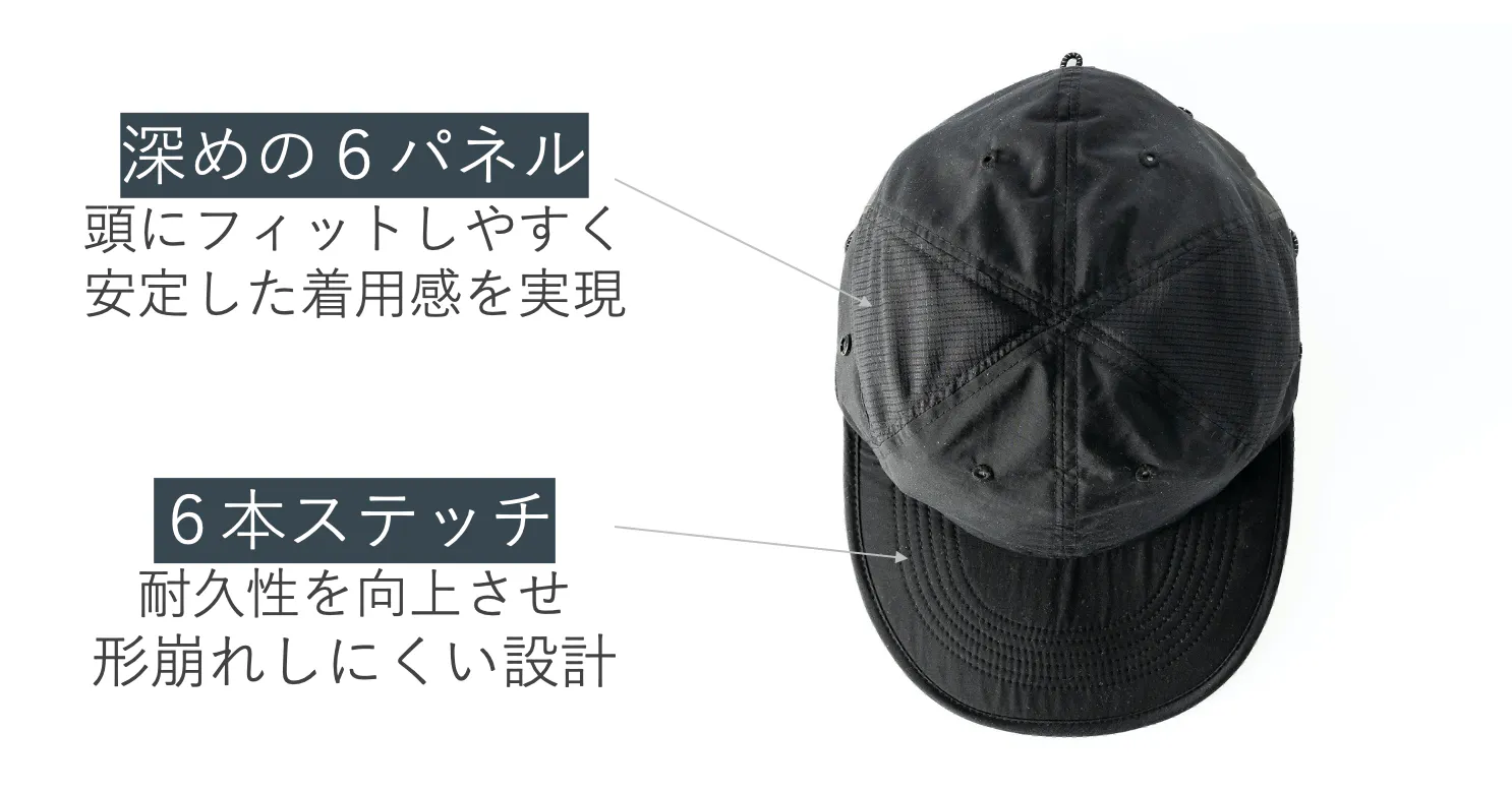まず、本製品はクラシカルな深めの6パネル形状を採用。頭にフィットしやすく、安定した着用感を実現しました。耐久性を向上させるべく、ブリム(つば)のステッチは6本にし、形崩れしにくい設計です。