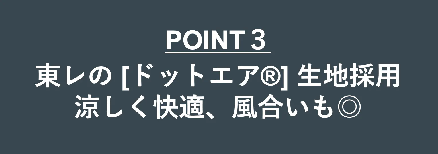 頭の側面に位置するメッシュ部分には、東レの高通気快適素材「ドットエア®」を採用。特殊な原糸と織物構造をベースに東レ独自の加工技術が駆使されたものです。