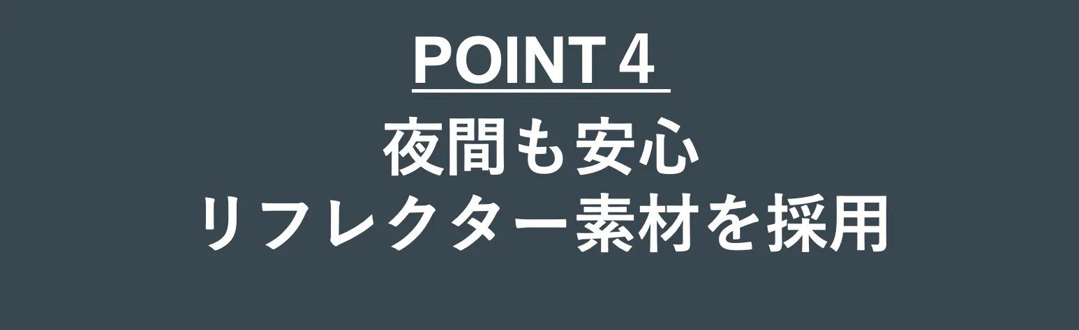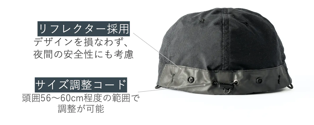 夜間の安全性に考慮して背面にリフレクター素材を組み込みました。コード部分で頭囲56〜60cm程度の範囲で調整可能です。
