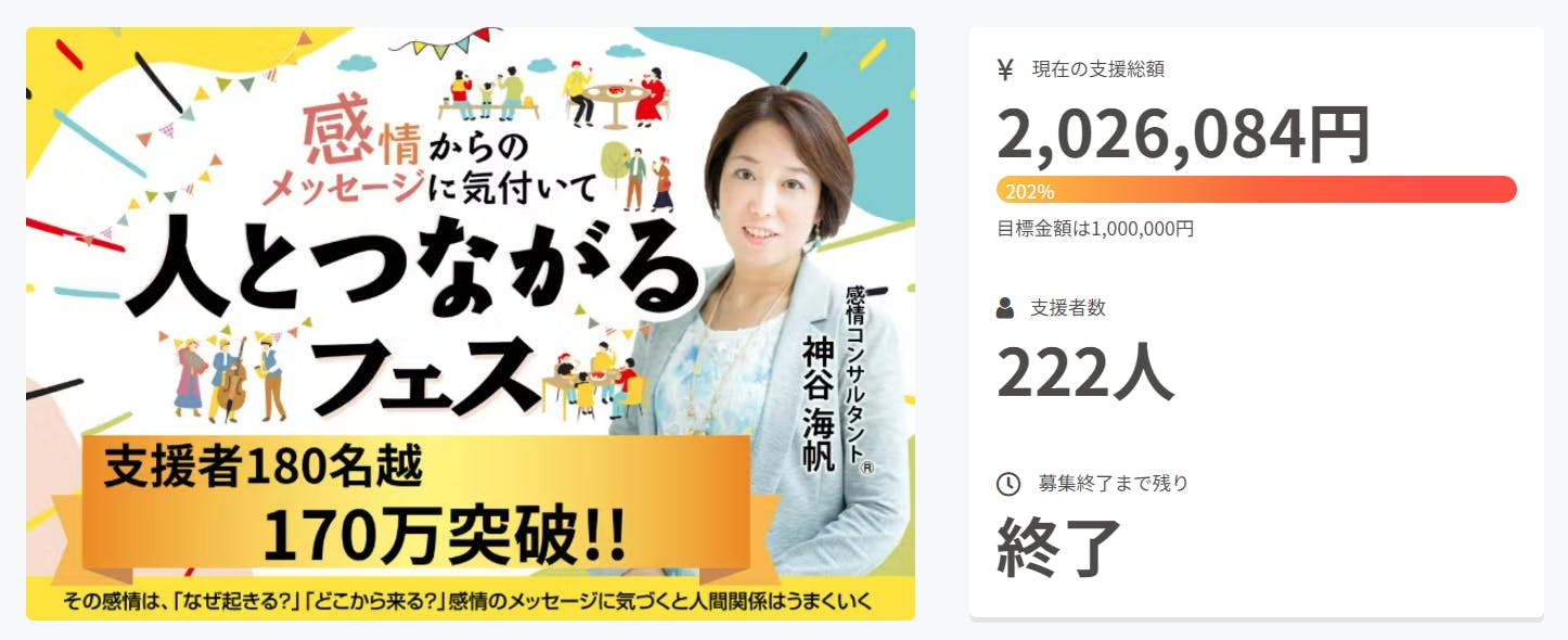 2024/06/03 17:12みなさま昨日でクラウドファンディングが終了しまして最終 なんと!2,026,084円 / 222人の方にご支援いただきました。目標から202%達成できたのも本当にみなさまのおかげです。心から感謝です。本当にたくさんの方に支えられ応援のメッセージに勇気とエネルギーをもらい私の夢もみなさまに叶えていただきました。昨日は終了の24時までライブ配信を行いましたが最後は感謝と感動で涙が溢れました。リターンについては、順次ご連絡をさせていただきます。「感情からのメッセージに気づくと、人間関係はうまくいく」6/8出版講演会&懇親会について「申込まだ間に合いますか?」というお問合せを頂いております。クラウドファンディングでの受付は終了しましたがまだ申込は可能です。こちらからお申込みいただけますのでご希望の方がいらっしゃいましたら、ご案内ください。https://syuppankinen.hp.peraichi.com/syuppankinenクラウドファンディング開始時は不安と焦りの気持ちでいっぱいでしたが昨日は本当に最後の1秒まで楽しくそして感謝の気持ちで終了することができました。本当にありがとうございます。感謝の気持ちを込めて神谷海帆 もっと見る