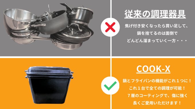 さらに7層の特殊コーティングを採用したCOOK-Xは、傷に強く汚れツルリと落ちるので、フライパンの買い替えや鍋の焦げ付きで悩む必要がありません!