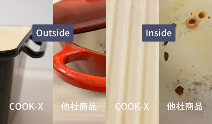 A- COOK-Xは鋳物ホーロー鍋という素材でできております。高い熱伝導でうまみを閉じ込めながら調理することが可能です。 また優れた保温性により、調理中から調理後までお料理のうまみを逃すことはございません。 これは丁寧に作られているCOOK-Xの鋳物ホーローならではの魅力といえます。