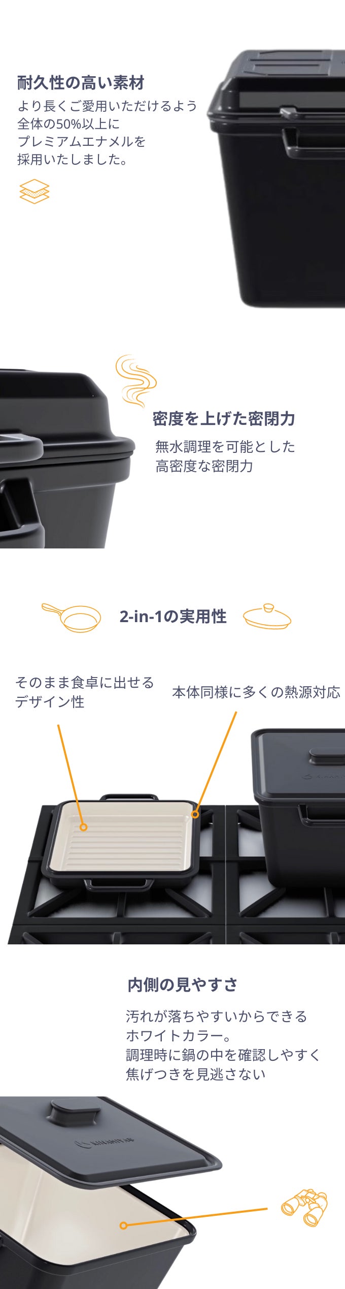 ホーロー鍋は食卓のグレードを引き上げる最適なアイテムであり、COOK-Xは、2-in-1(本体、蓋の同時調理)のエッセンスを加えることで「効率性・利便性」を引き上げ食卓のグレード、幸福度を上げることに目指しました。