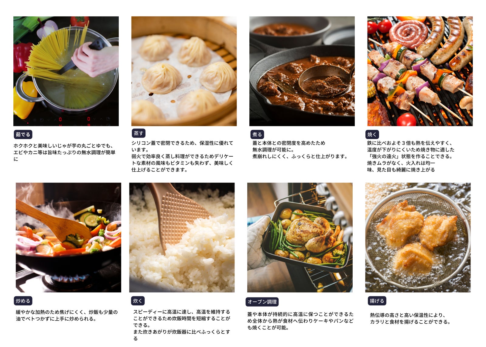 ▼1台で【茹でる・蒸す・煮る・焼く・炒める・炊く・揚げる・オーブン調理】の8役!