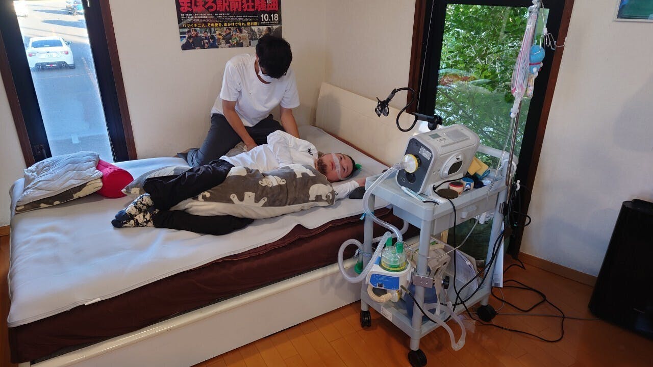 呼吸する筋力の低下により、1年半ほど前から鼻に装着するタイプの人工呼吸器を取り付けながら生活をするようになりました。呼吸器の管理には看護師さんのサポートが必要になります。