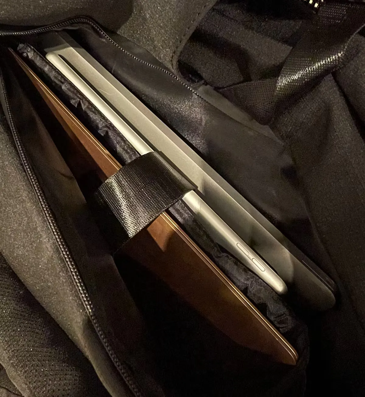 PCやタブレットなど、ビジネスアイテムも背面の独立したスペースに収納することができます。