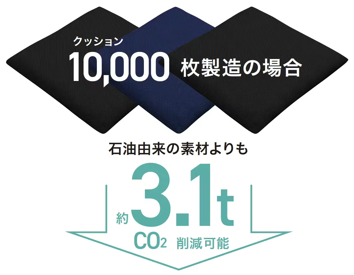 環境に優しい3DメッシュクッションGRECO は、寝具などで採用されている3Dメッシュクッションに、初めて植物由来成分の樹脂である、グリーンポリエチレンの配合に成功したクッション素材です。