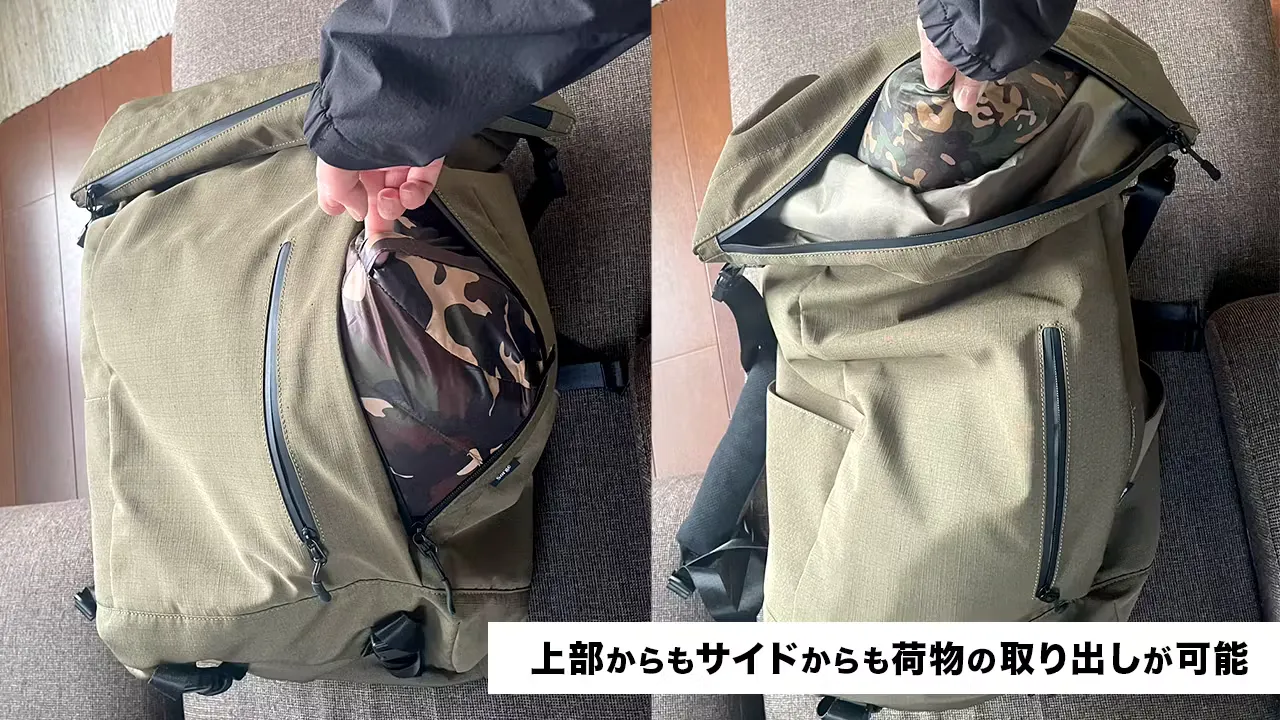 大容量のバックパックによくある「底の方の荷物が取り出しにくい」という課題…、メイン収納部分は、上からも横からも取り出せる構造を採用。これにより荷物の取り出しが簡単になりました。