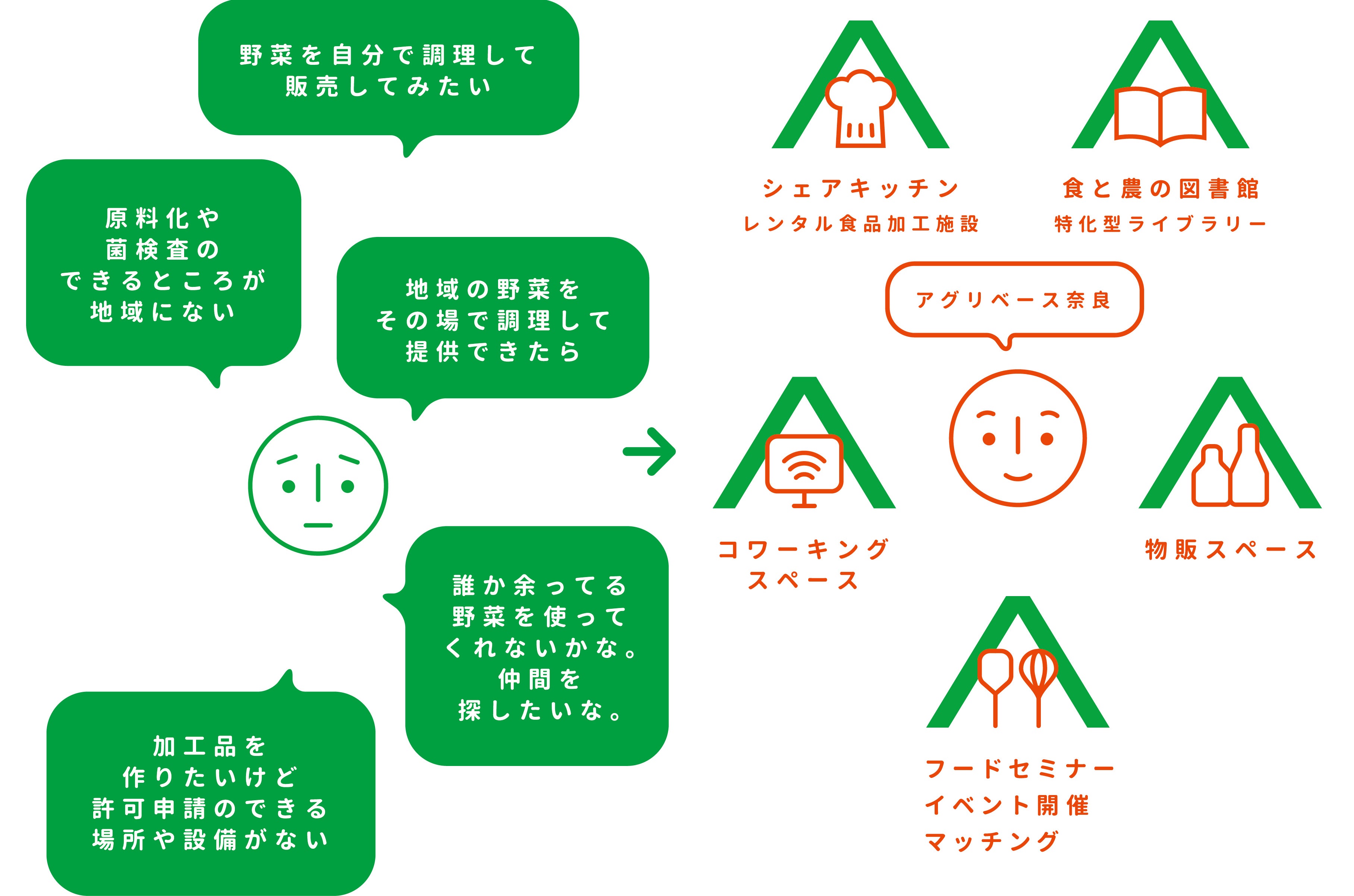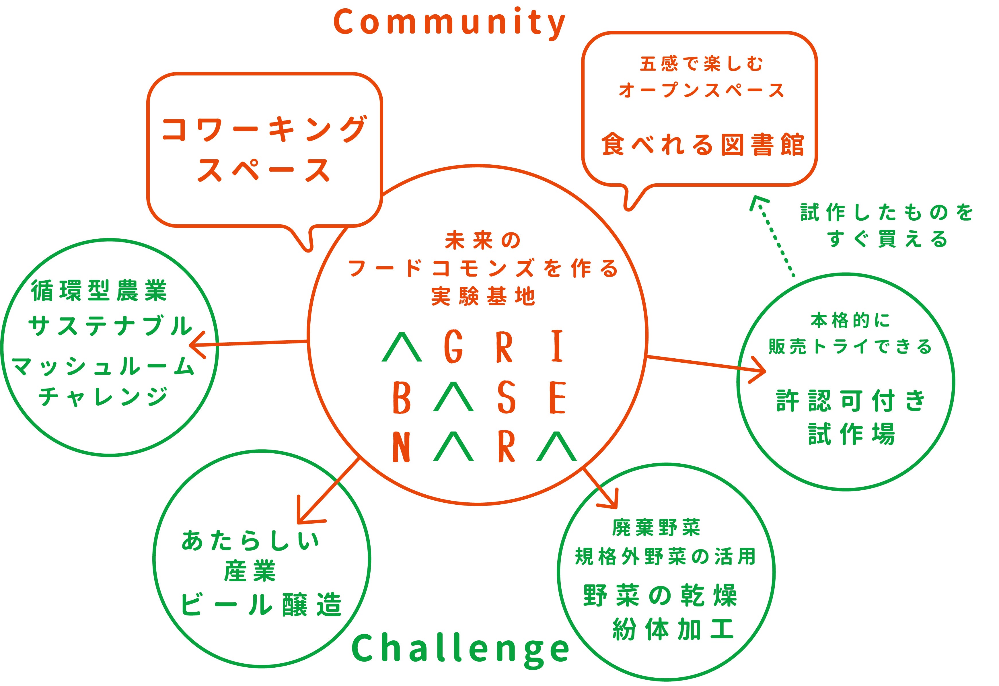AGRI BASE NARA図書館で食と農の知識や構想が得られたり、ここでの出会いによって新しいつながりやプロジェクトが誕生するような、そんなモノとヒトとの出会いの空間を実現します。さらにご支援状況によってイベントで販売するための製造や試作ができ、様々な販売アドバイスも受けることができるところまで整備していきます。