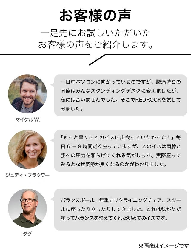 「REDROCK レッドロック」をご使用になる前に、ユーザーご自身で、健康状態、運動のスキルレベルの確認やチェックして下さい。慣れないうちは普段使わない筋肉を動かすため、かなり疲れるかもしれません。慣れてきたら、座る時間をだんだんと延ばしてみてください。時間をかけてイスの安全な使用方法を理解いただき、徐々にイスの動きに慣れていただくことを強くお勧めします。