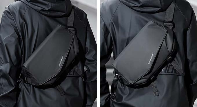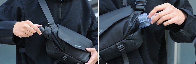 横型の設計で左右に大きく開くので、スマホやiPad、モバイルバッテリーなどものをすべて入れても、余裕のあるサイズ感で装着感を損ないません。