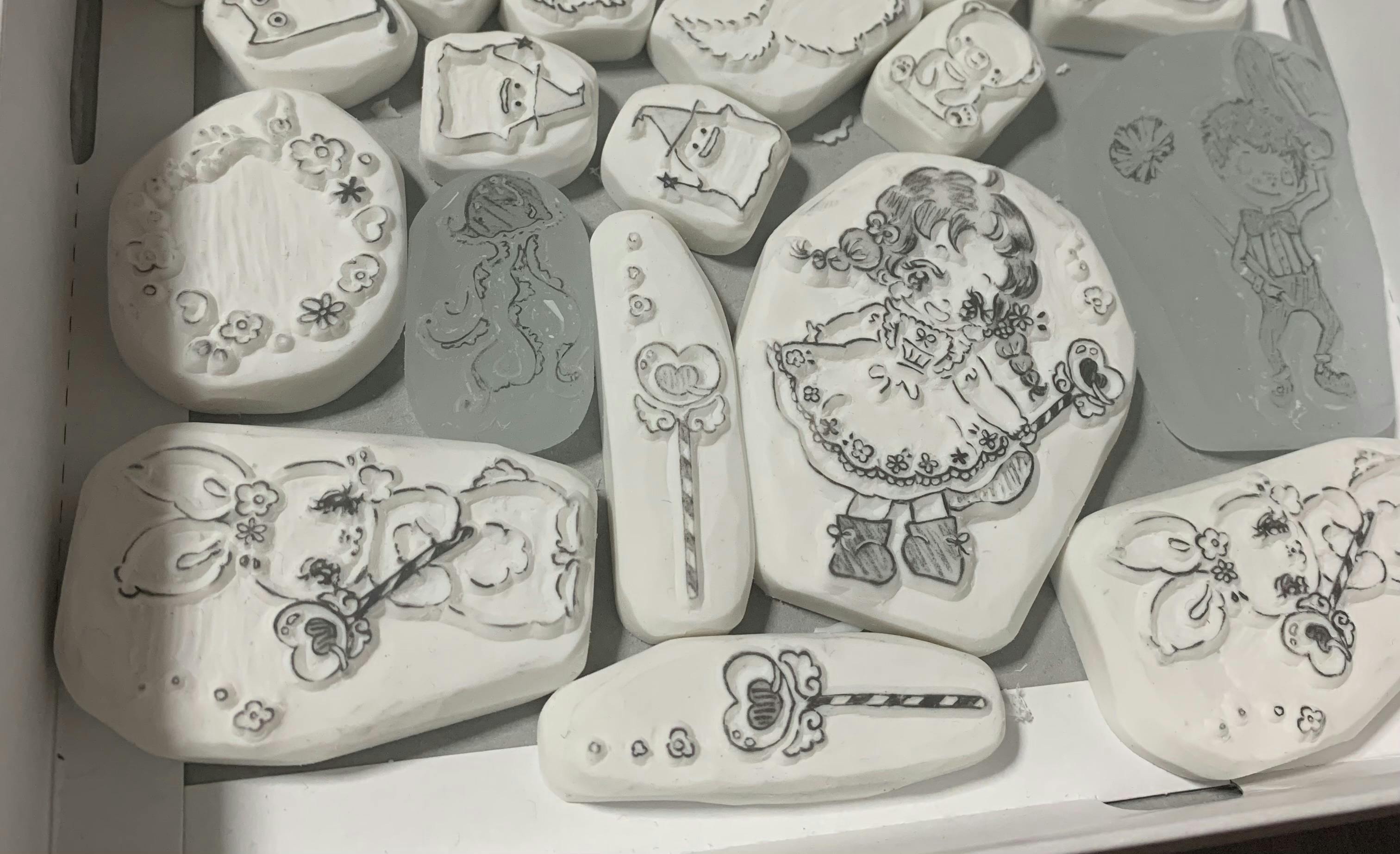 (オーブンで焼くと透明になるはんこ用消しゴムを使用して作っています。)