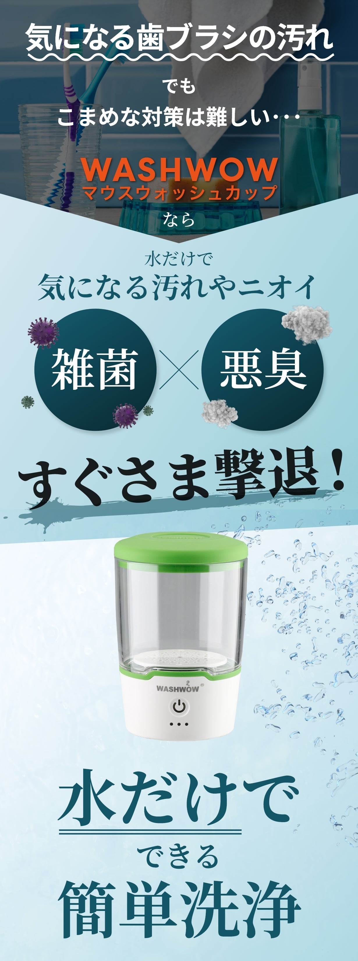 オーラルケア用品や入れ歯は、細菌が繁殖しやすいため、適切に手入れをすることが困難です。しかし、WASHWOWの技術を使用すれば、この問題は大きく軽減されます。電解水に浸すという簡単な手順で、常に清潔さを保つことが可能になります。