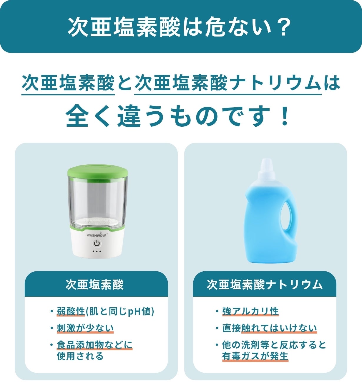 次亜塩素酸水は、塩素系漂白剤に使われる「次亜塩素酸ナトリウム」とは異なる成分であり、日本の厚生労働省では食品添加物として認可されています。