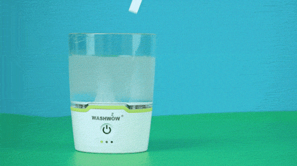 WASHWOWは、通常の水道水を除菌・消臭効果のある電解水に変換する、まるで魔法のようなデバイスです。このシステムを使用することで、水が電気分解され、電解水へと変化します。カップに水を入れ、ボタンを押すだけで、わずか30秒で電解水が生成されるのです。