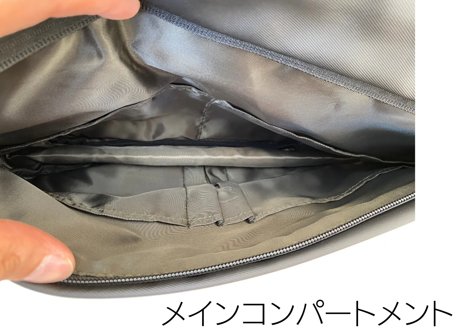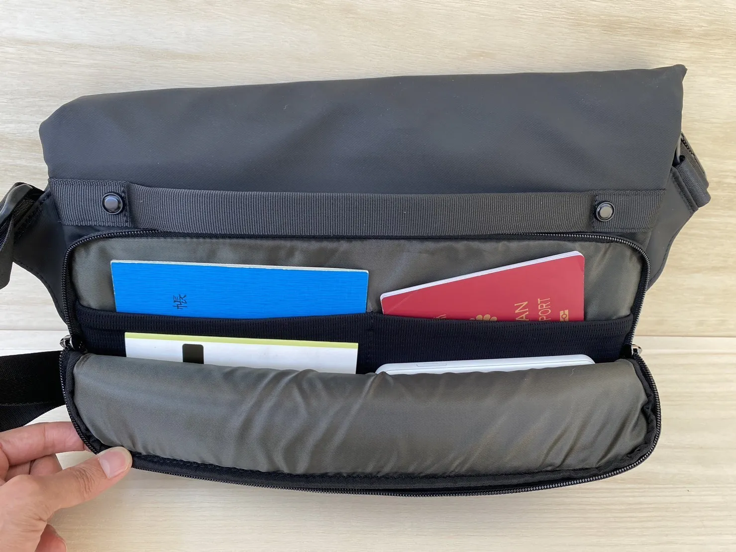 バッグの背面には、ファスナー付きのコンパートメントがあります。メインの収納エリアの他に2つのポケットも付いています。ポケットには銀行通帳を横にして、パスポートを縦に収納可能です。横 33cm 縦15cm でB6サイズまで収納可能です。