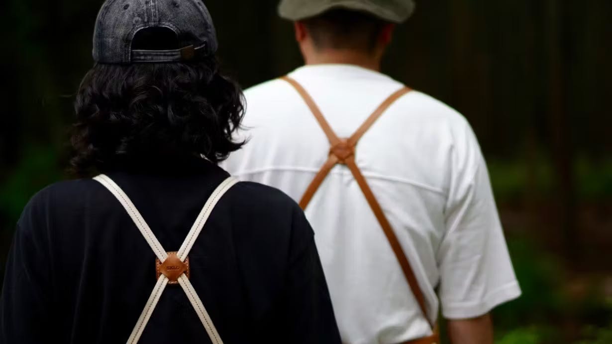 肩紐は背中で X にクロスする仕様にこだわりました。革工房の現場でもエプロンはよく使用するのですが、着用時間が長くなるにつれ、首にかけるタイプのエプロンは首、特に頚椎に負担を大きく感じます。今回の製品ではキャンプツールを収納するなど重さが加わるため、なおさらこの点について考慮しました。