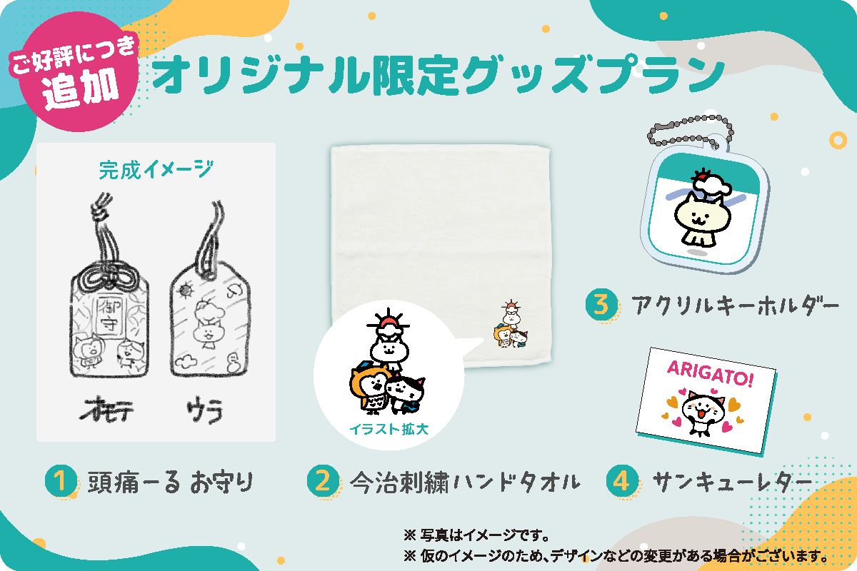 特製のお守り、刺しゅう入りハンドタオル、キーホルダーなど限定グッズのプランです