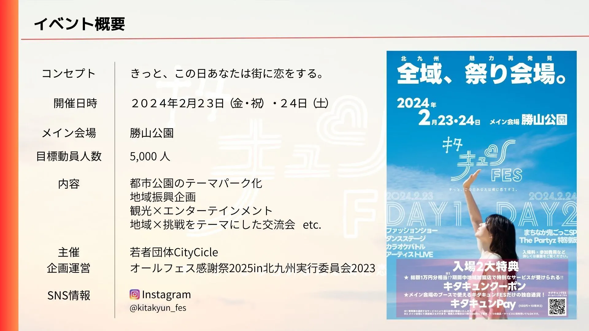 そして、私たちは「キタキュンFES」を通して北九州市の魅力を再発見し、「このまち好きかも」と思ってもらえる仕掛けを提供します。