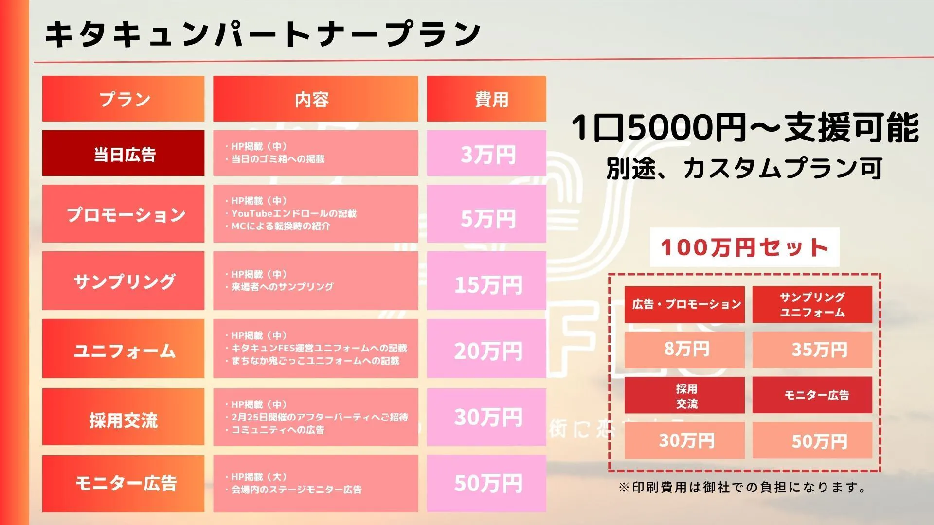 キタキュンFES公式HPの掲載や活動ダイジェスト動画エンドロールへの記載、転換時のMCによる紹介を行います。