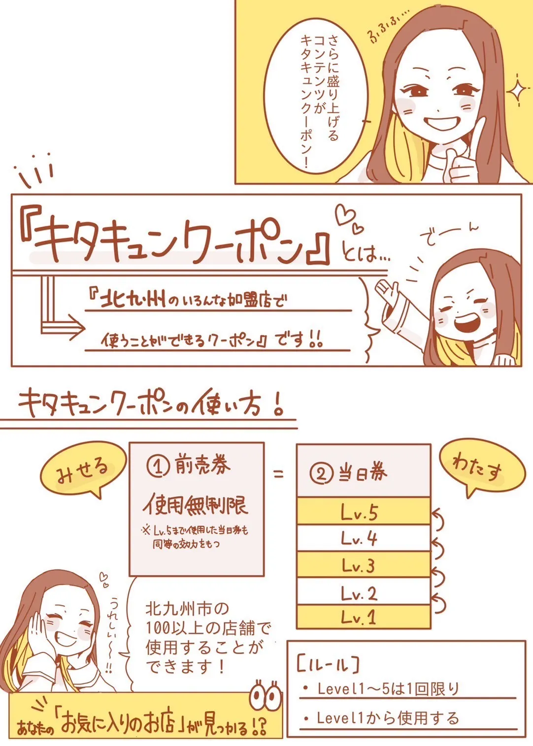 また、北九州市とキタキュンFESを「より多くの人に堪能してもらいたい」という想いから、地域の方々にご協力いただき100店舗でのサービスを受けることができるキタキュンクーポン、会場内でたくさんの体験をできるようにと100円×10枚綴りの(会場内で1,000円分のお買い物ができる)キタキュンPAYを入場特典として準備をしています。
