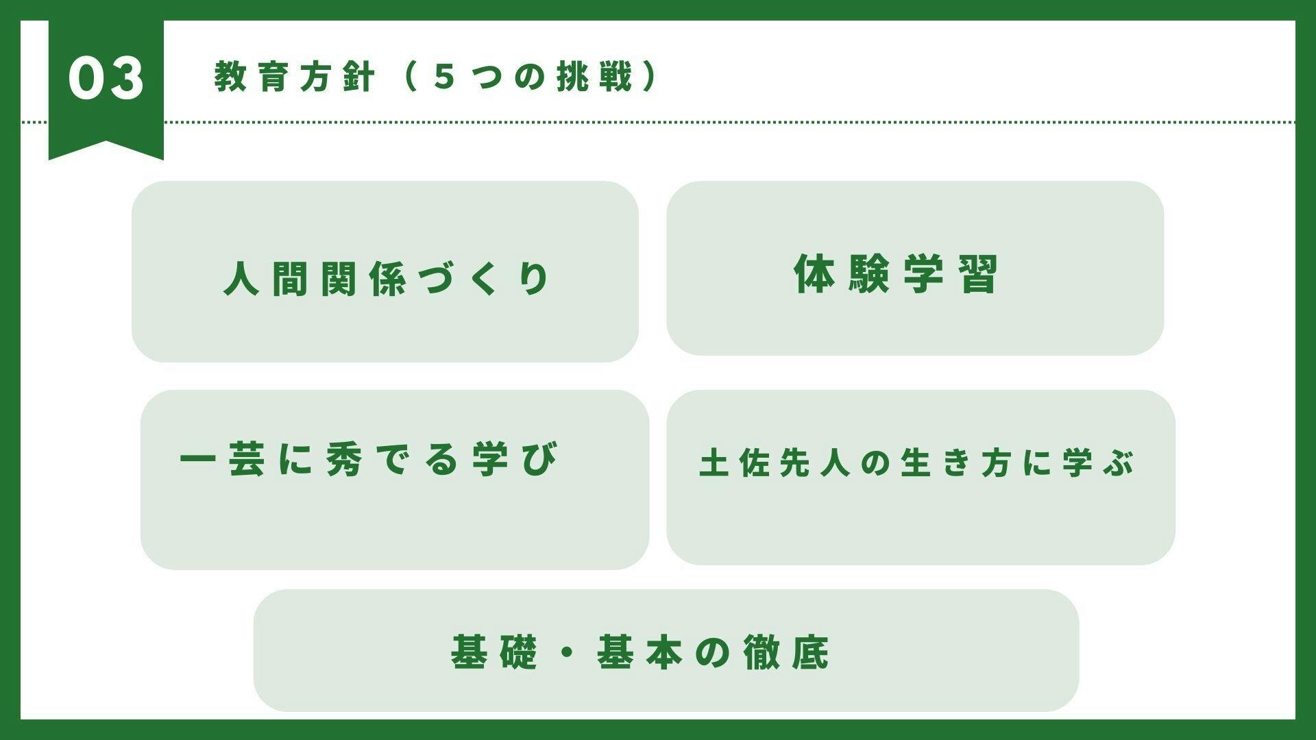 高知県いの町の豊かな大自然を舞台として、五感を養いながら、仲間と共に安心して楽しく過ごせる居場所づくりを目指しています。自分で課題を見つけ探求し、仲間と協働しながら、主体的に考えて行動できる子を育てます。 自分の個性、相手の個性を認めあい、なりたい自分を目指す場所です。