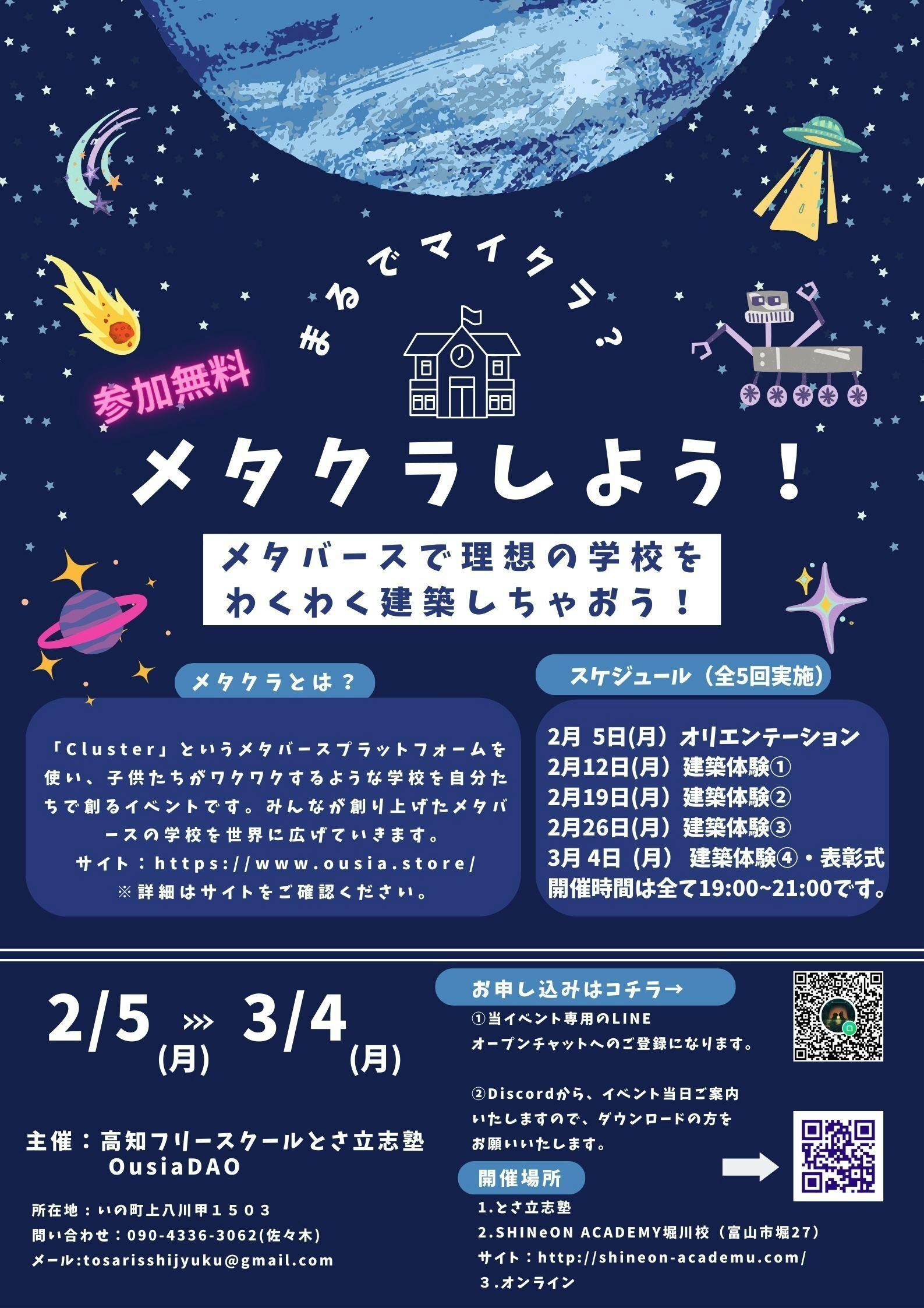 子どもたち1人ひとりの「やりたい・なりたい!」を応援する学びを提供したいと、OusiaDAOさんと協働でメタバーススクールのイベントを2月に開催することとになりました。「cluster」というメタバースのプラットフォームを使い、子どもたちがワクワクするような学校を自分たちで創るイベントです。前回10月に開催したメタバーススクールでは、各チームごとにわかれてみんなで話し合いながら、どんな学校だったら面白いか?互いに対話しながら、創り上げていきました。操作がわからない子でも、わかる子が丁寧に教えてくれたりと、ネット上でいろんな子との交流ができました。それぞれのチームごとに個性溢れる学校ができてとても面白いイベントとなりました。