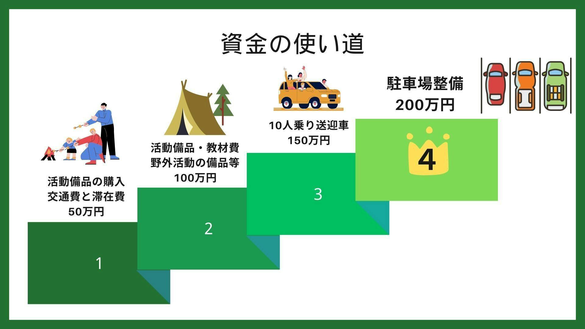 ネクストステージ:100万円で、活動備品、教材費、野外活動用の備品等が購入できます!