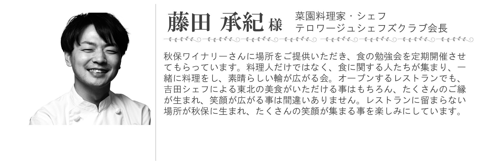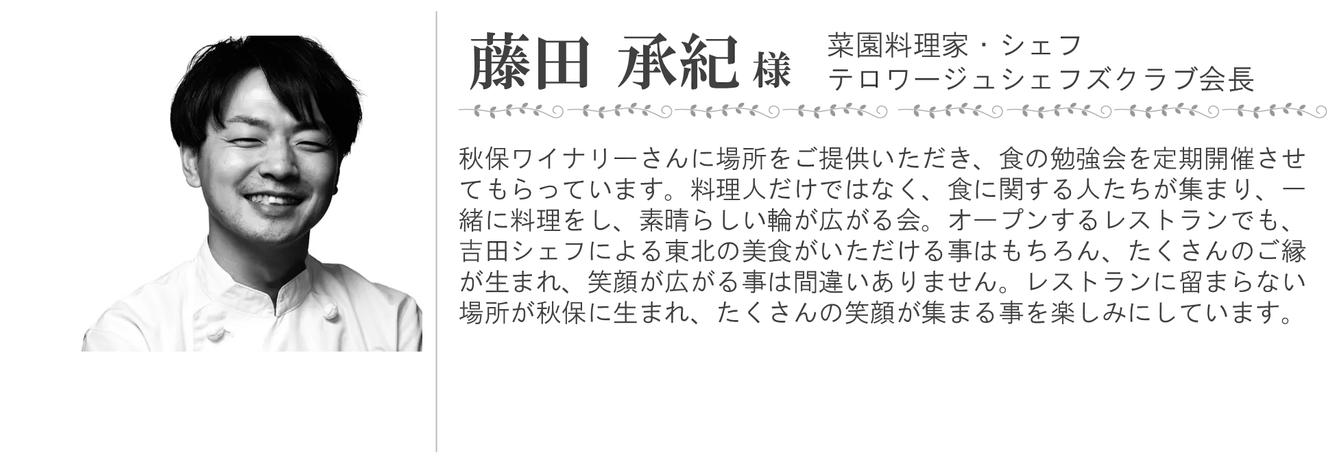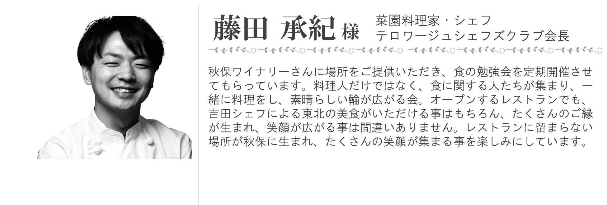 レストランを始めるにあたり、心強いシェフにも参画いただけました。宮城県角田市出身の吉田克則シェフです。吉田シェフはイタリアンのシェフとしての実績はもちろん、ワインの知識も豊富で、食とのマリアージュを追求した料理に定評があります。多くのファンを持つことから、レストランの開業を心待ちにする声が絶えません。生産者の想いを大切にしながら、食材の持ち味を最大限に引き出し作り上げる吉田シェフの料理を、是非ご堪能いただければと思います。