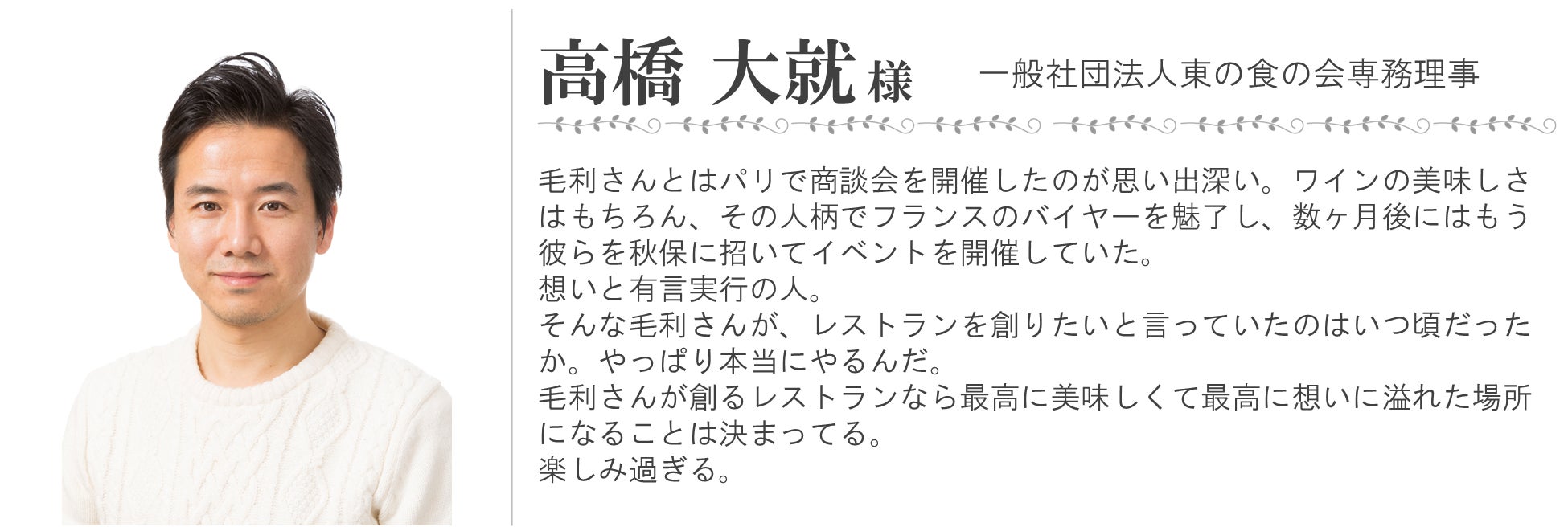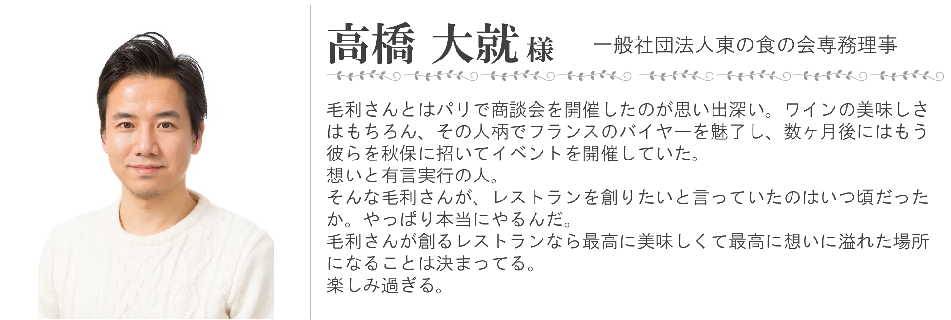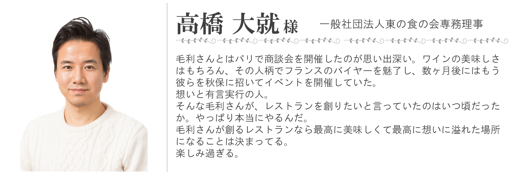 毛利親房(Chikafusa Mori)。株式会社仙台秋保醸造所・代表取締役、株式会社秋保ツーリズムファクトリー・取締役。1968年シアトル生まれ。仙台育ち。元々仙台市内の設計事務所に勤務していたが、東日本大震災の後、被災自治体の復興計画策定に関わる中で、ワインの力で販路が回復しない東北の生産者を応援したいと決意し、秋保ワイナリーを設立。現在は、「テロワージュ東北」をはじめ、宮城、東北の食のPRや担い手育成に取り組んでいる。