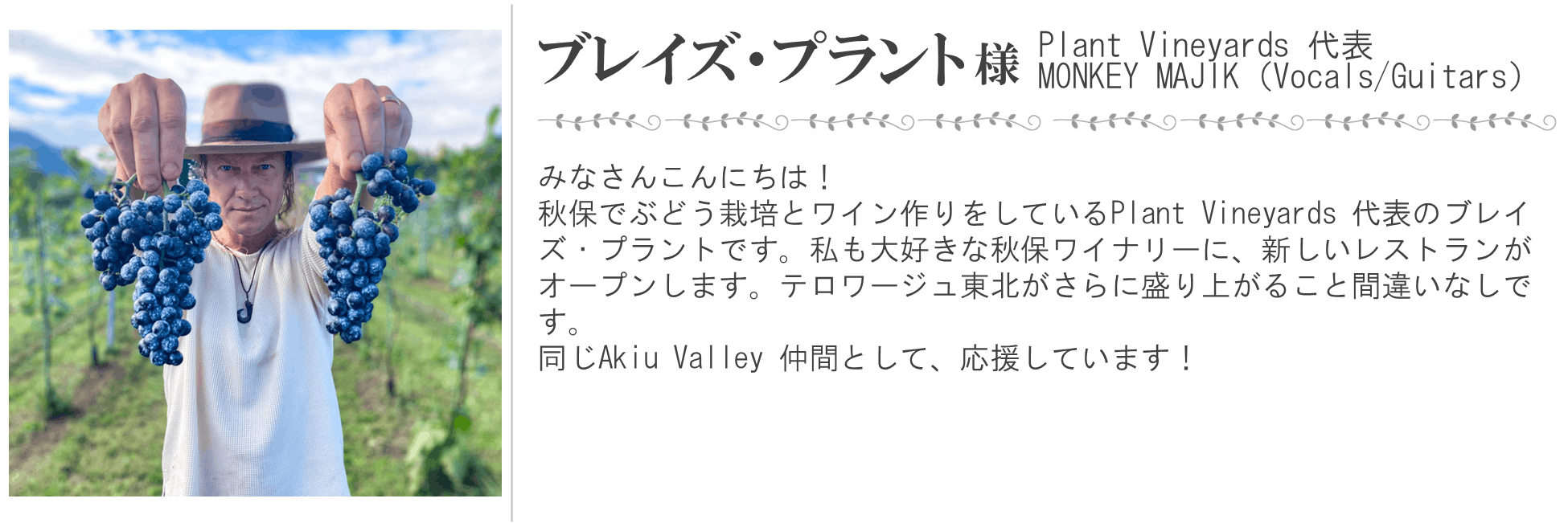 レストランでの飲食チケットはもちろん、遠方の方もテロワージュを体験できるよう、東北の食やお酒のセットを充実させました。東北有数の温泉地である秋保の宿泊付きプランもご用意しておりますので、是非これを期に直接、東北の魅力を味わっていただけますと幸いです。また、テロワージュの担い手の一人として、長期的に私たちの仲間になっていただけるよう、店舗へのお名前の掲載や、レストランで利用できる「テロワージュ秋保カード」もご用意しております。