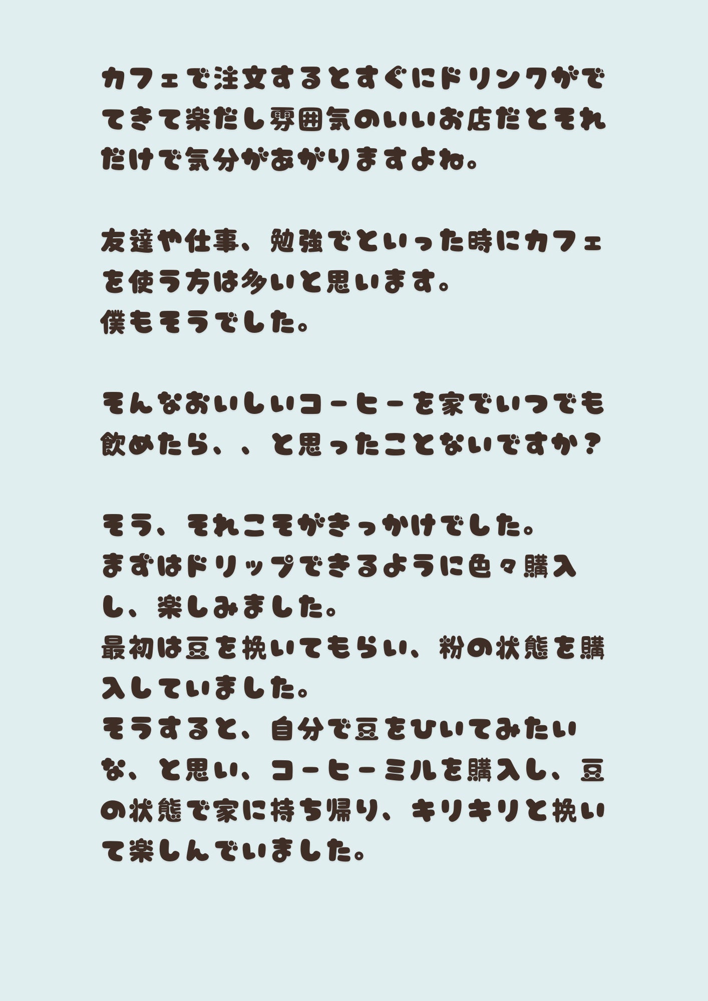 2023/12/16 11:13スタンプカードのスタンプのご紹介です(⁎⁍̴̛ᴗ⁍̴̛⁎)2つ折りにするとスタンプのインクが財布や他のカードとかにつかないのもメリット|•'-'•)وナイス!スタンプは豆100g買うと1個です(((o(*゚▽゚*)o)))10個ためると豆100gプレゼント^ ̳ට ̫ ට ̳^20個ためると豆200gプレゼント^ ̳ට ̫ ට ̳^そして謎のしえるコイン1枚お渡しします( . .)"このしえるコインをためると、、ゎ‹ゎ‹(๑ ᷇ 𖥦 ᷆๑)♡ゎ‹ゎ‹コーヒーメーカーやコーヒー器具、お店のオリジナルグッズと交換できます!コーヒーメーカーも色々ありますが、特にオススメのものや、お客様のニーズに合わせた商品を選んで頂けます!交換対象の商品はコロコロ変わります𖦹' ‐ '𖦹中にはかなりの高額の商品もご用意する予定です*⸜(* ॑꒳ ॑* )⸝*ワンダホォォォォイ相当のコインが必要となりますが、コインシステムは普段通り豆を買い続けて頂けると勝手に貯まる、おまけと捉えて頂ければ幸いです(#´ᗜ`#)ニコニコそして、このカードやコインの有効期限はありません(*゜Q゜*)よく有効期限のあるカードが多いですが、僕自身、有効期限内に何かと交換出来たことはあんまりありませんでした。有効期限があると、購買意欲を駆りたてるかも知れないお店の手法だと思いますが、自由にのんびりご自身のペースで貯めて頂き、ある時に、お!?コインこんなに貯まってる!ってなったら小さな幸せですよね( ´˘` )そんな小さな幸せを感じてもらえれば嬉しいです꒰ঌ(๑≧ᗜ≦)໒꒱⋆⸜♡⸝⋆ちなみにこのスタンプカードはたまってもお店では回収しません^ ^豆日記があるのでスタンプいっぱいになってもお客様のお手元に(⸝⸝ ´艸`⸝⸝)あ、コインは回収しますよ…:(•ㅿ•`):申し訳ございません。。これはまた検討段階ですが、豆日記は見たいけどやっぱりカードがたまっていくのはなぁ~って思う方には、本当の日記みたいに冊子にしてお渡ししようかな、と思いますꈍ .̮ ꈍ手作りなのでクオリティは低いと思いますが(;´∀`)・・ァハハハ・・ハハ・・ハ・・"サービスのひとつとして思ってもらえれば- ̗̀( ˶^ᵕ'˶)b作成費用は、無料にしたいと思っていますが、厳しければ有料サービスになるかもしれませんが、そうならない為に頑張りますねฅ•ﻌ•´ฅ もっと見る