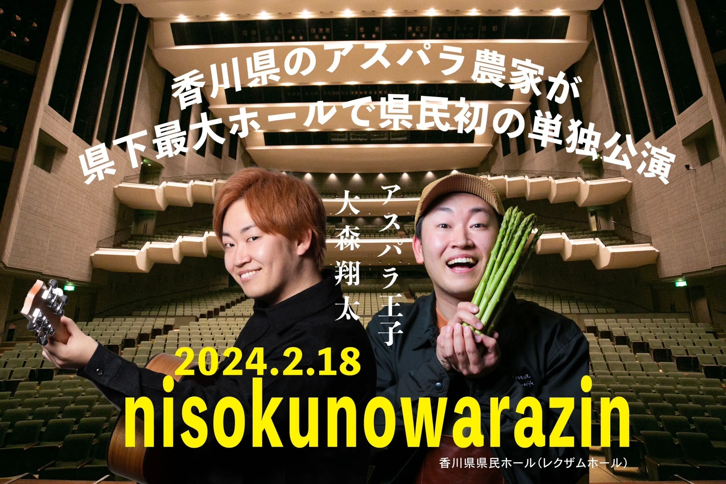 この度アスパラ農家という枠を大きく飛び越える挑戦、(というか分不相応な大舞台)香川県民県人初となる”レクザム大ホール″でのワンマンライブを演らせていただくことが決定しました!!何事〜!!