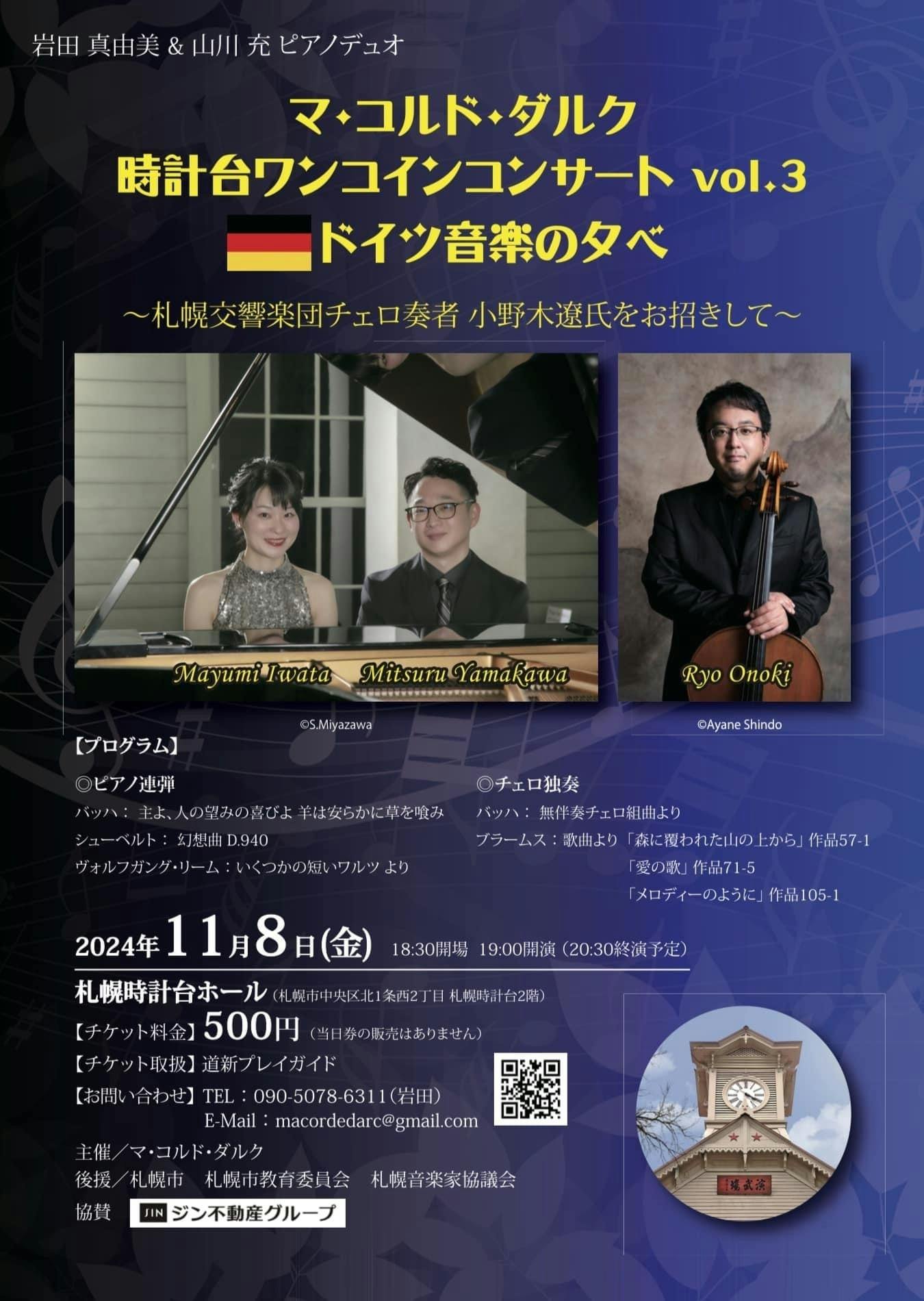 2024/10/21 22:09時計台ワンコインコンサートvol.3スペシャルゲストに札幌交響楽団員チェロ奏者の小野木遼さんをお迎えし、ドイツ音楽をお送りいたします。前半はマコルドダルクの連弾でバッハの名曲「主よ、人の望みの喜びを」シューベルト最晩年の作品「幻想曲」今年亡くなったドイツの作曲家ヴォルフガング・リーム「いくつかの短いワルツ」後半は小野木さんのバッハ無伴奏組曲、ブラームスの歌曲をお楽しみ下さい♪クラウドファンディングリターンのご招待券、ご用意いたしますのでご入用の枚数をお知らせください。 もっと見る次回時計台ワンコインコンサートの日程が決定しました