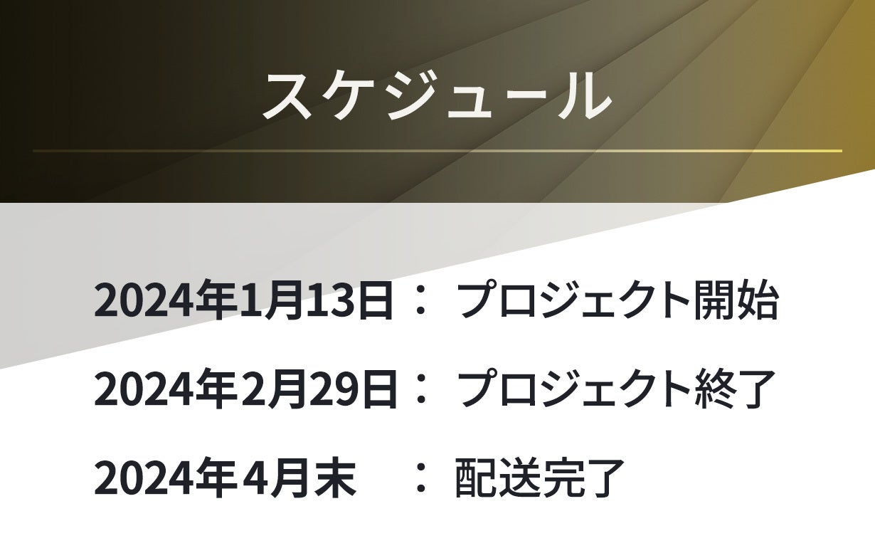 ●引渡し時期: 各リターン詳細に記載の発送予定月を引き渡し時期とします。但し、開発・生産状況によって遅れが生じる場合がありますのでその際は当プロジェクトページ内の「活動報告」または購入者へのメール等で連絡します。