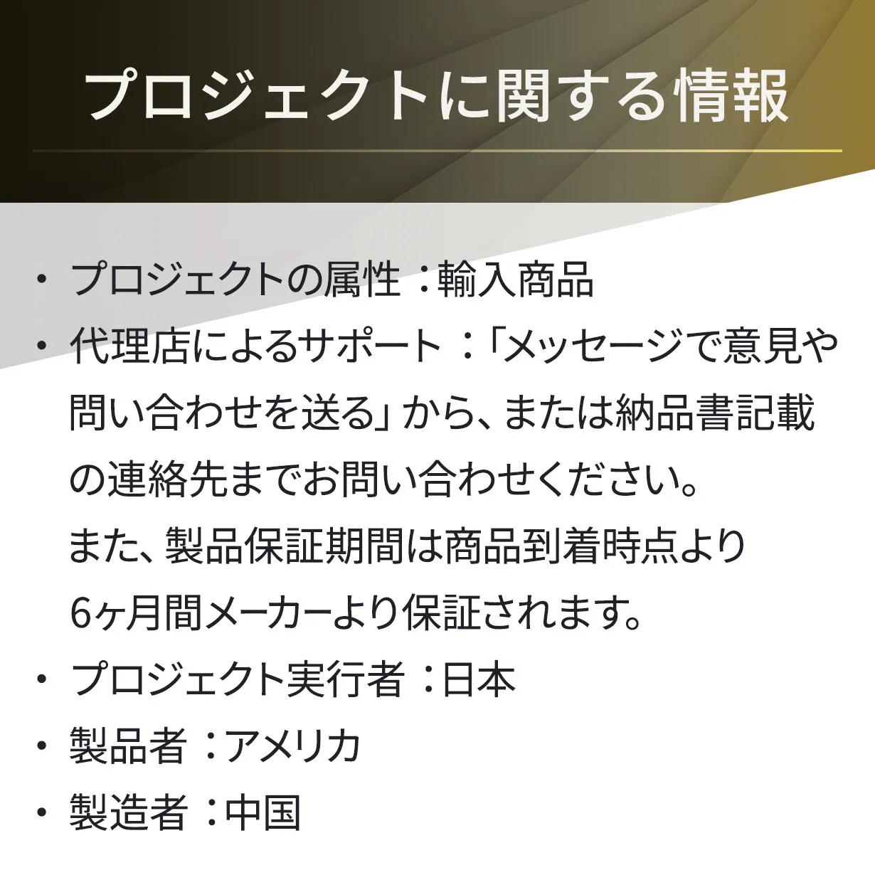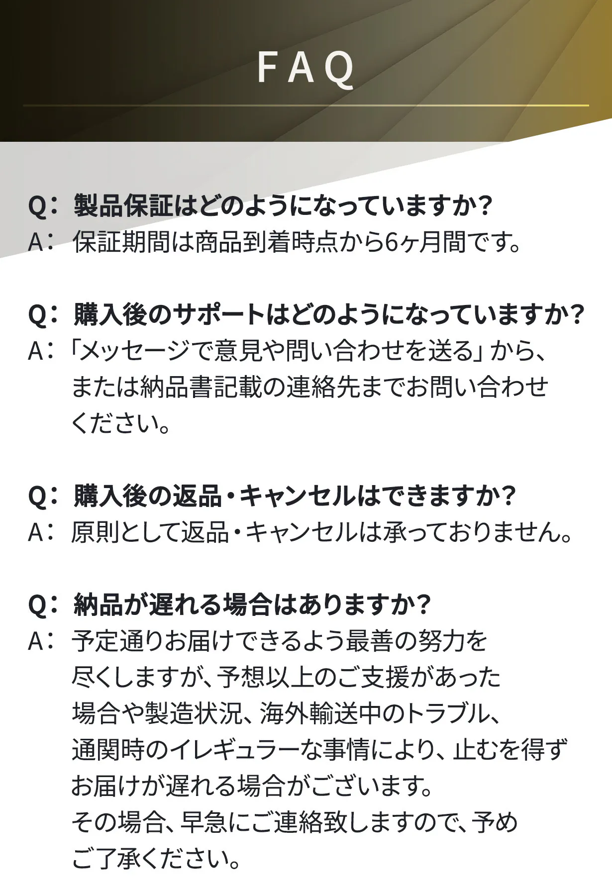 【出荷遅延】予定通りお届けできるよう迅速且つ丁寧に最善の努力を致しますが、予想以上のご支援があった場合や製造状況、海外輸送中のトラブル、通関時のイレギュラーな事情により、止むを得ずお届けが遅れる場合がございます。早急にご連絡致しますので、予めご了承ください。